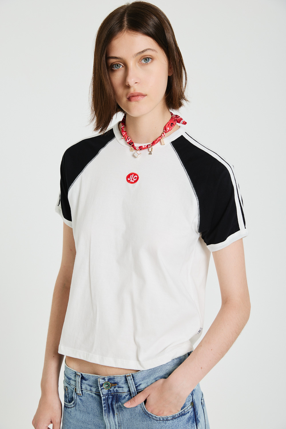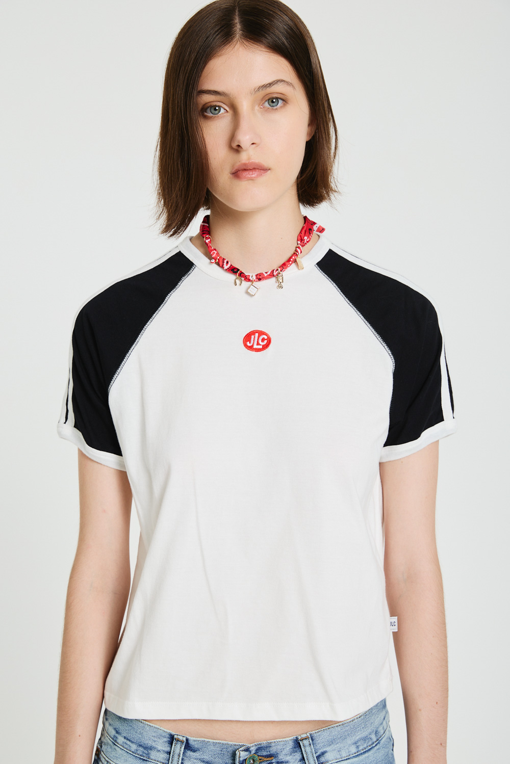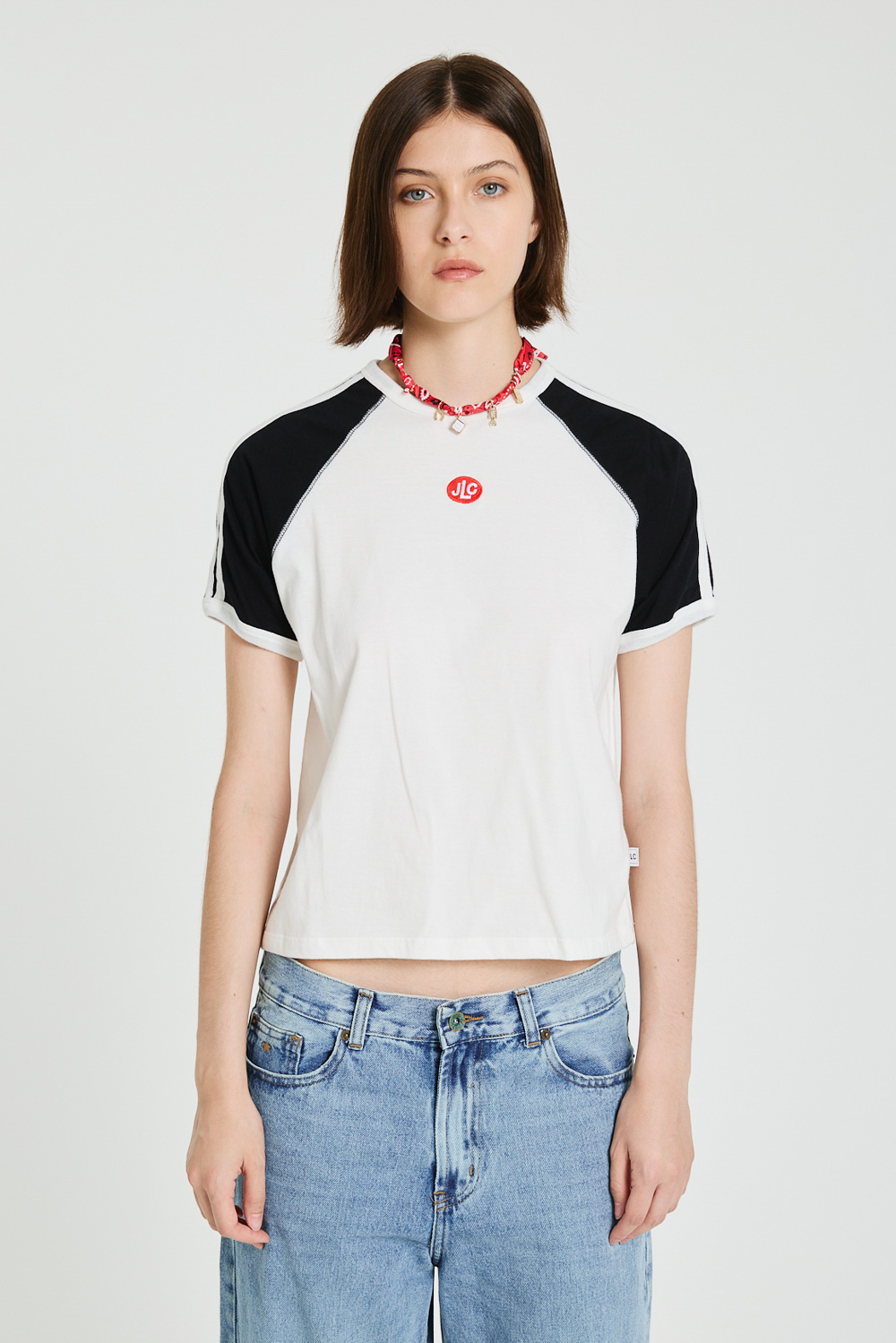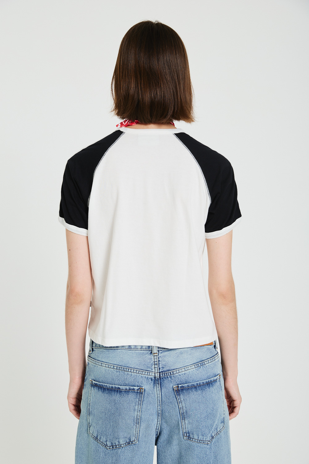 REMERA MANGA RANGLAN CORTA, COMBINADA. CON TIRAS APLICADAS A CONTRATONO EN HOMBROS.