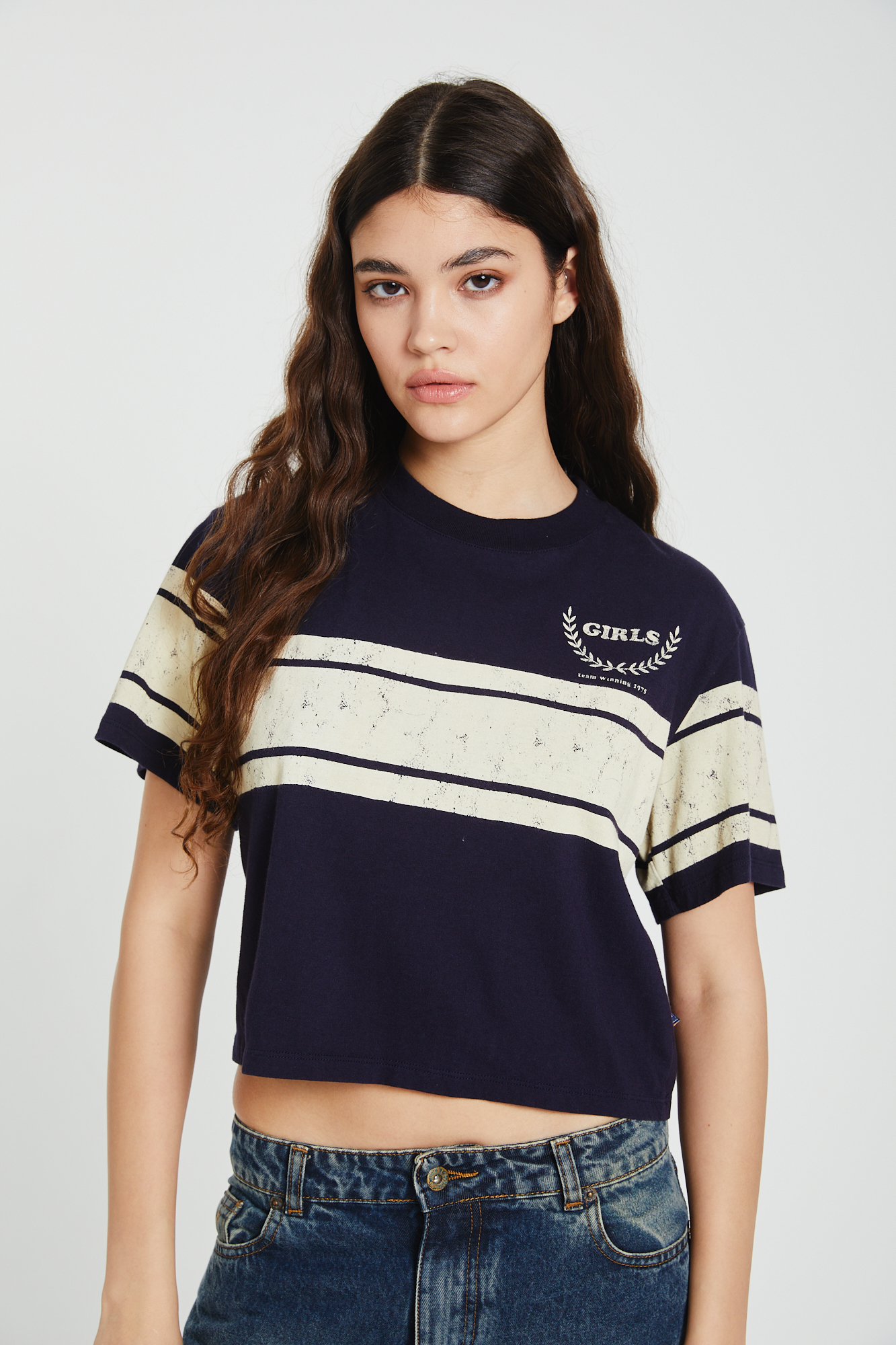 REMERA MANGA CORTA CONFECCIONADA EN MORLEY CON GOTA EN ESCOTE DELANTERO. CON DETALLE DE BORDADO EN MANGA Y TERMINACION DE RUEDO CON ROULOTE.