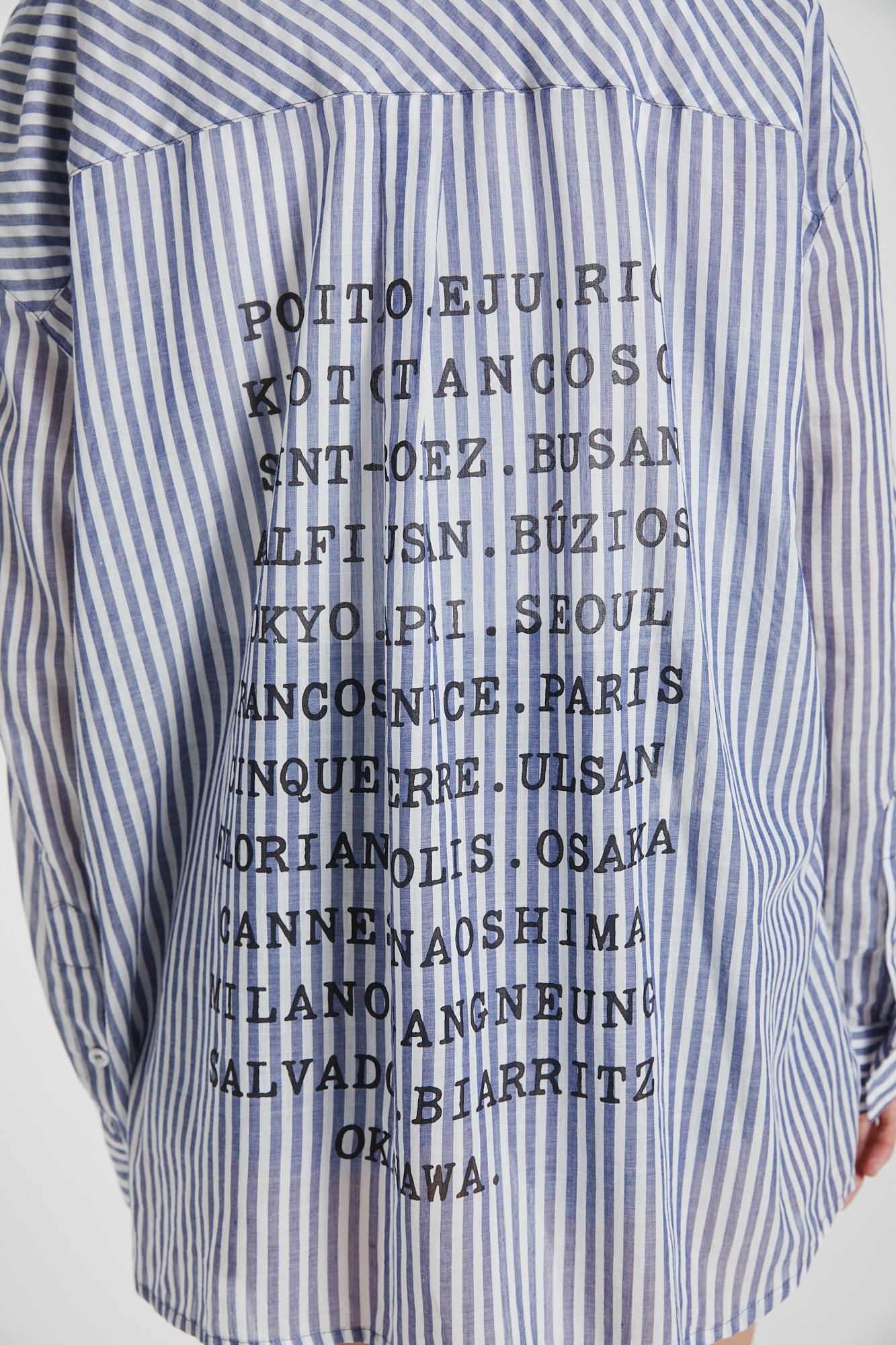 CAMISA MANGAS LARGAS OVER SIZE, RAYADA CELESTE Y BLANCO, CON BOLSILLO EN DELANTERO, Y ESTAMPA EN ESPALDA.