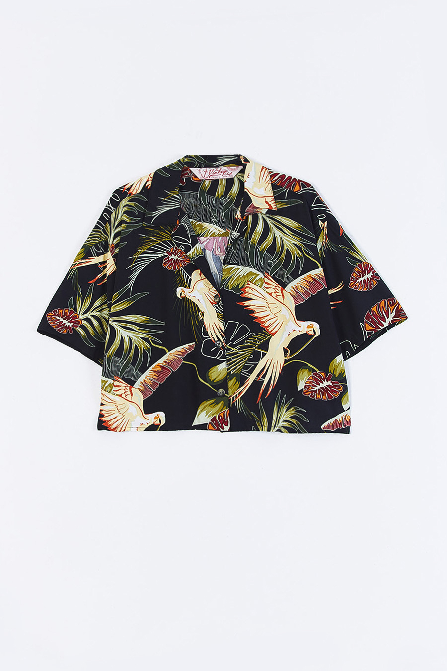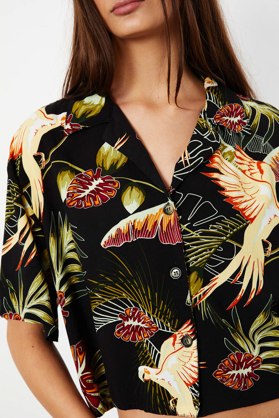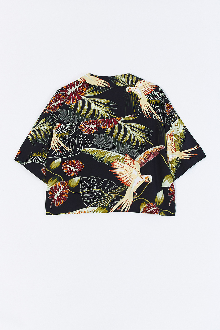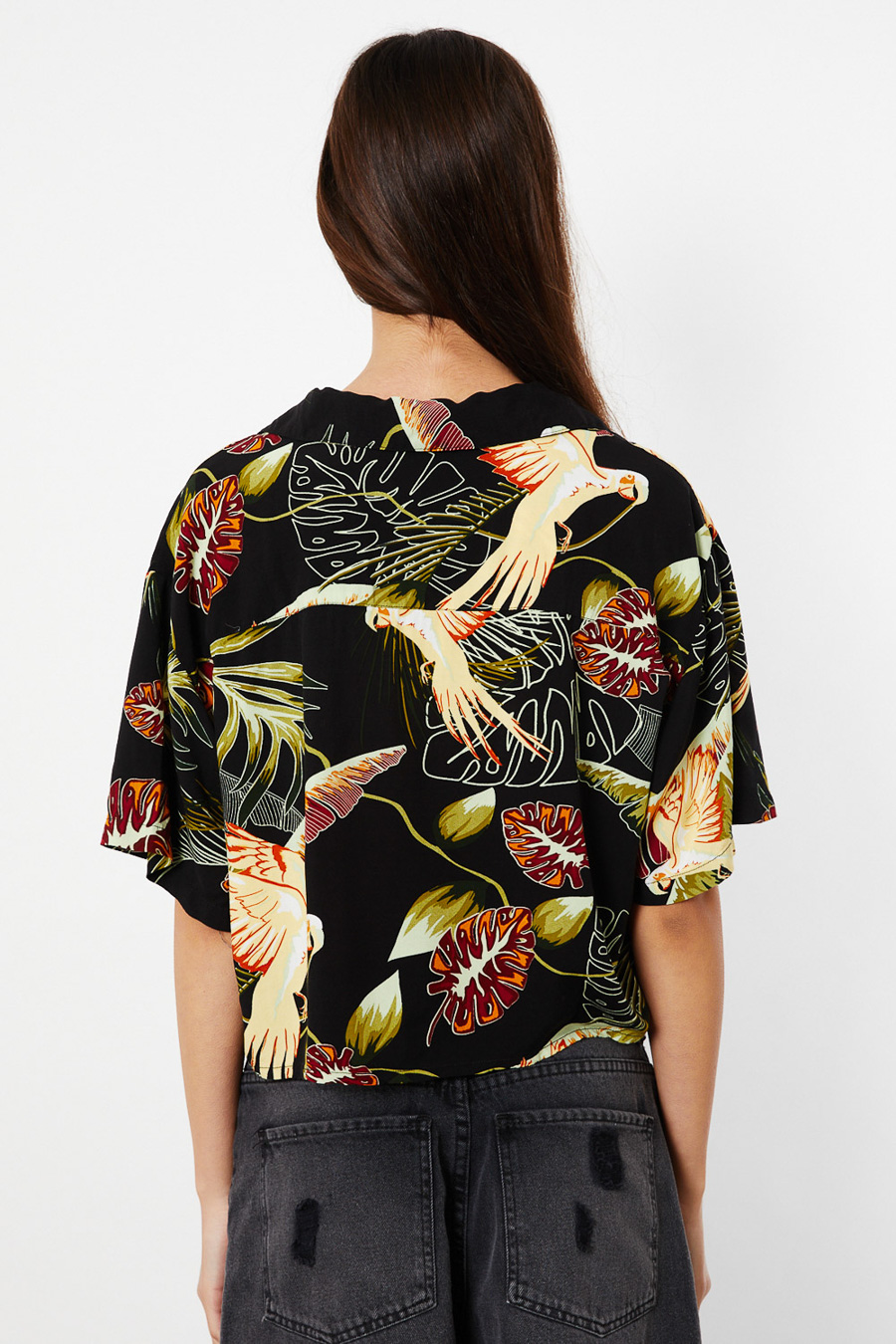 CAMISA CROP CONFECCIONADA EN FIBRANA ESTAMPADA. CALCE AMPLIO. ACCESO DELANTERO.