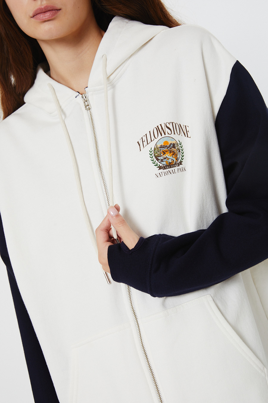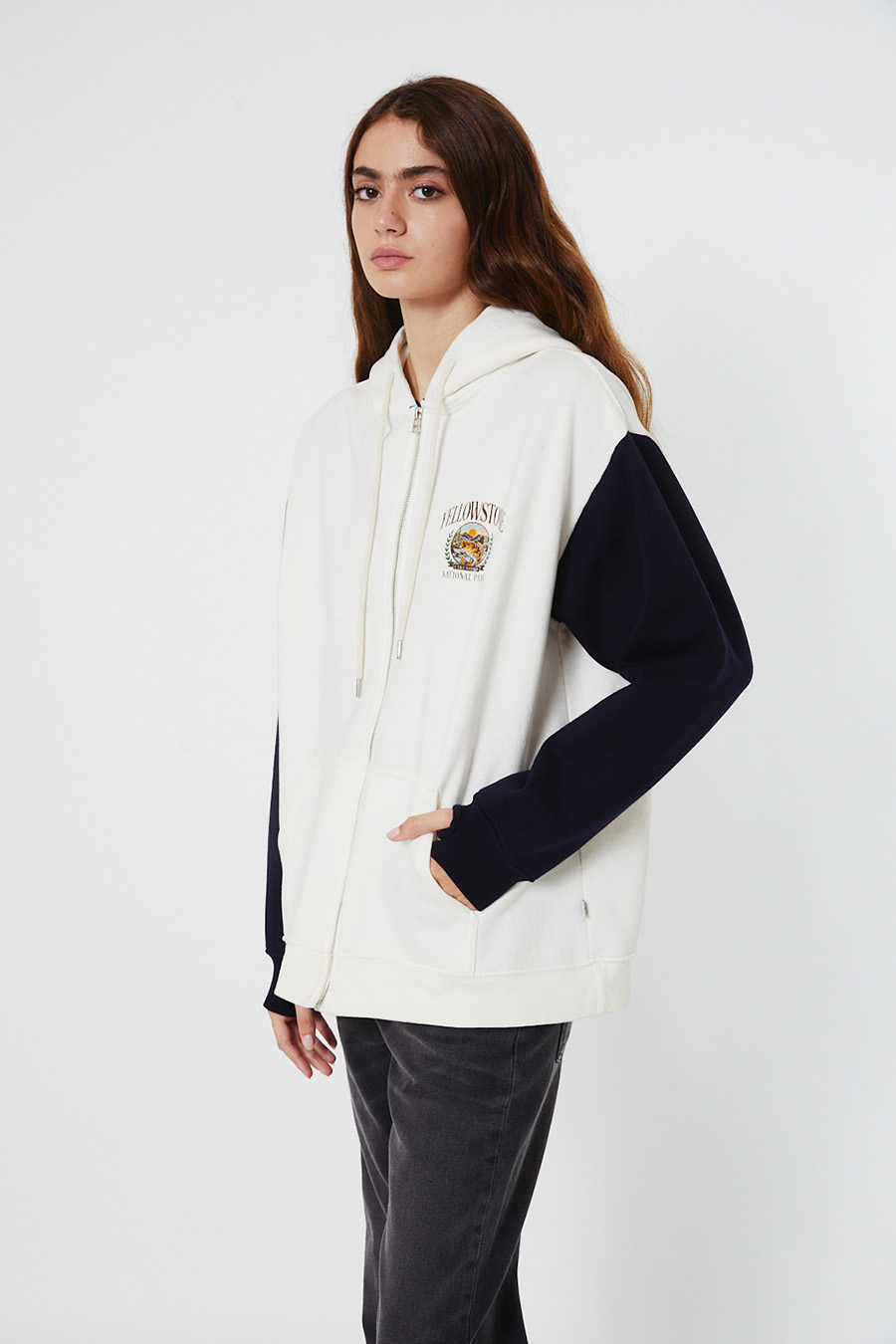 TRACK OVERSIZE CONFECCIONADO EN FRIZA COLOR TIZA, CON MANGAS COMBINADAS. ACCESO CON CIERRE DE CADENA METÁLICA, CON BOLSILLO CANGURO Y CAPUCHA. ESTAMPADO CON SERIGRAFIA ARTESANAL.