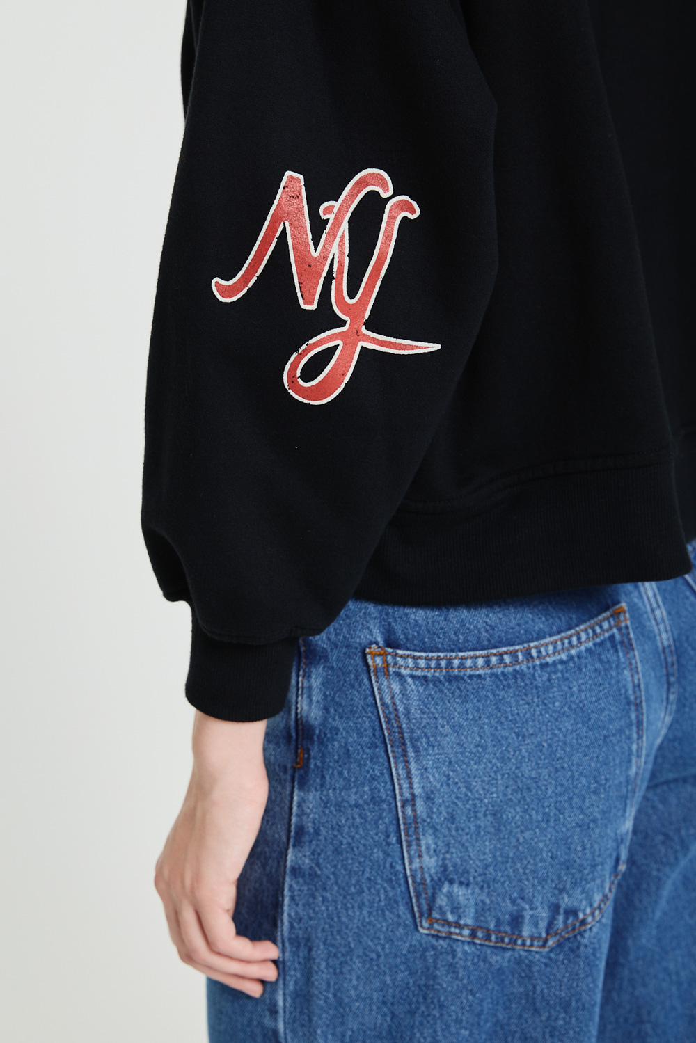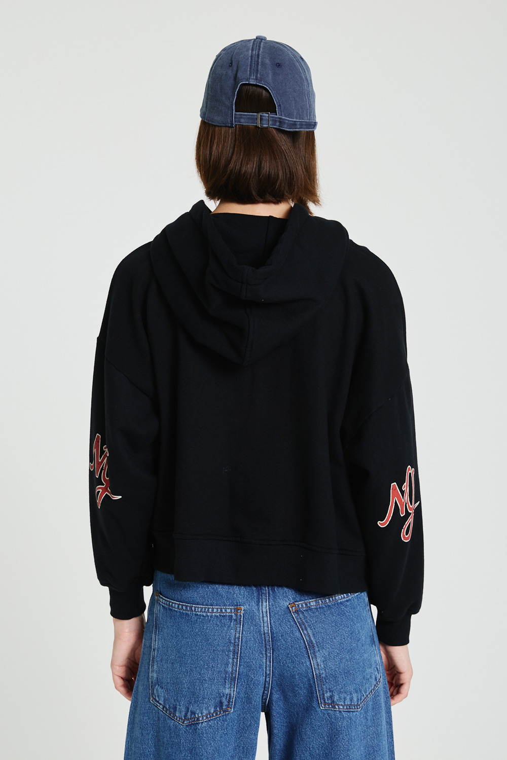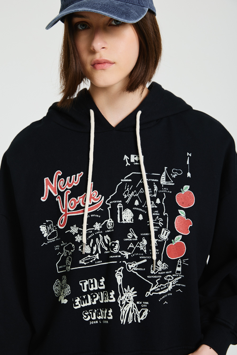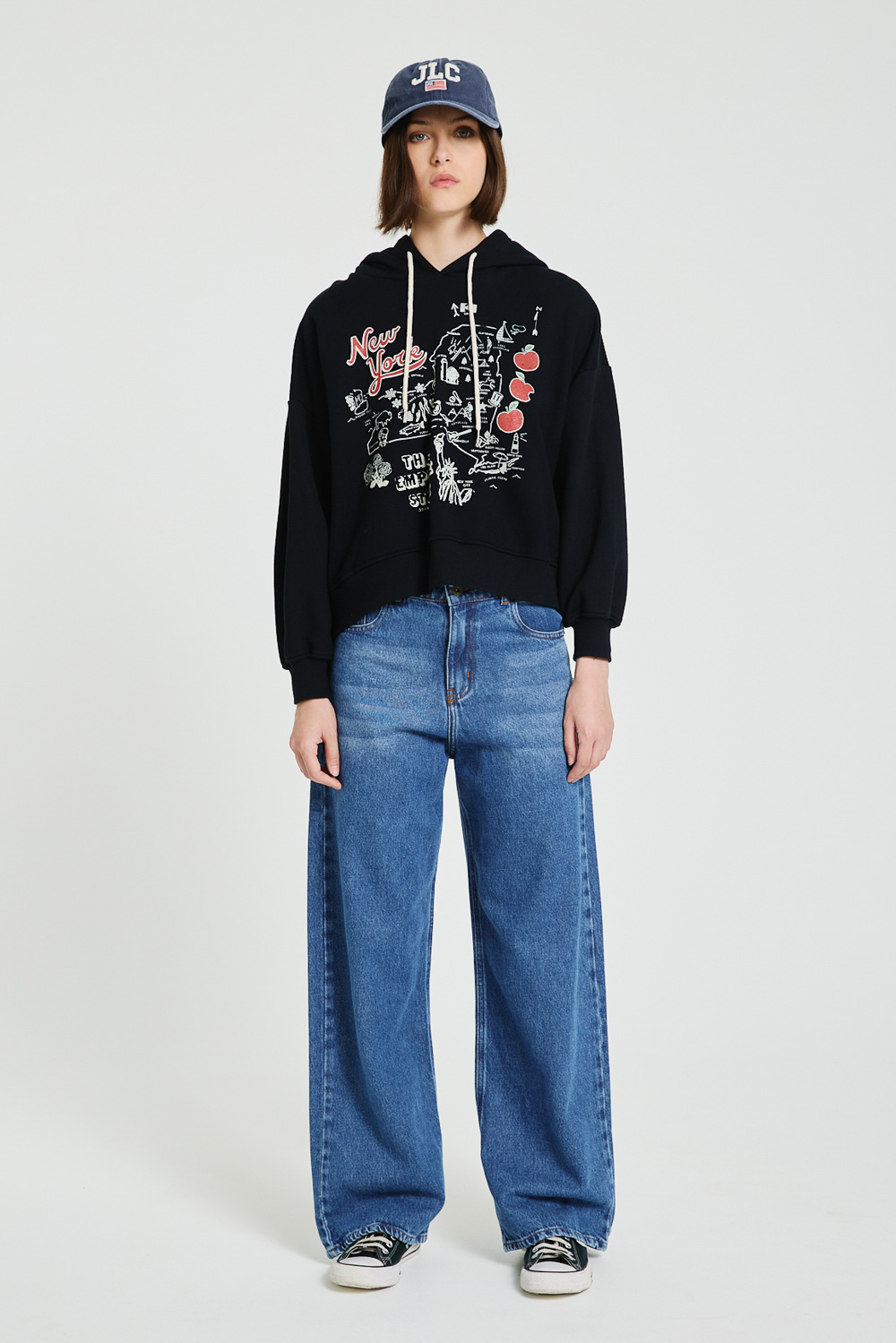 BUZO OVERSIZE CORTO CONFECCIONADO EN FRIZA, CON MANGAS LARGAS Y CAPUCHA. ESTAMPADO CON SERIGRAFIA.