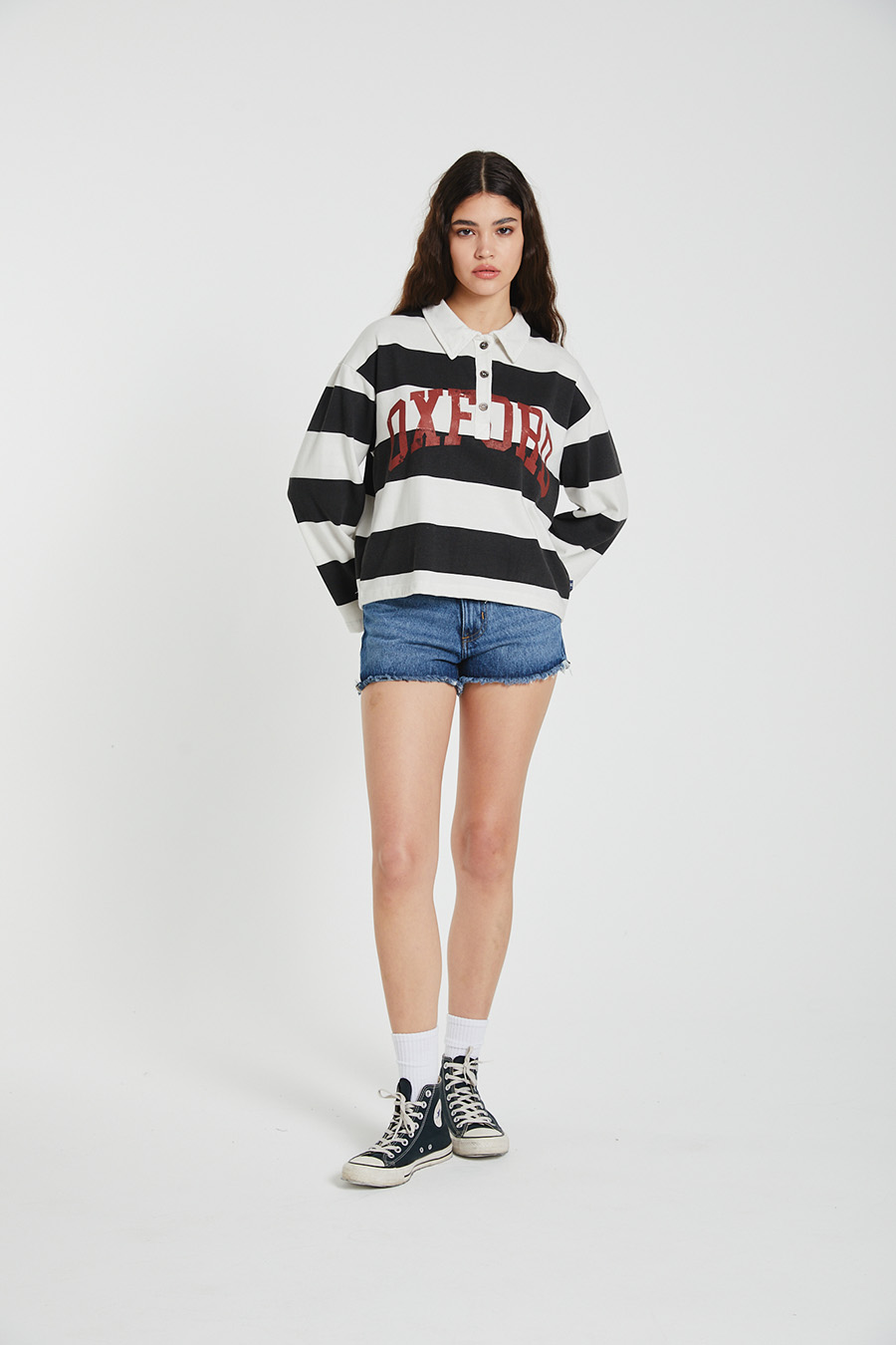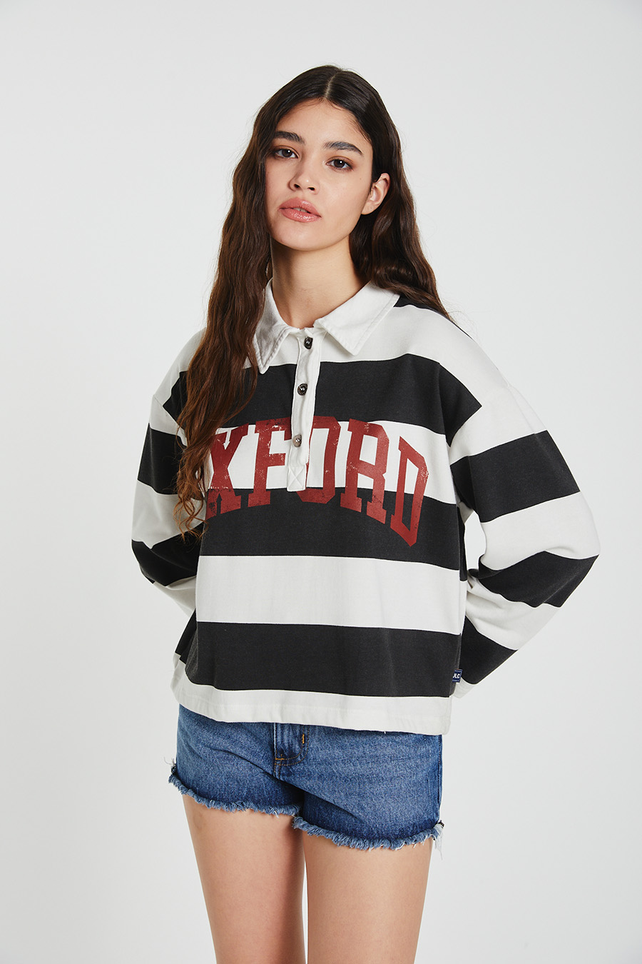 BUZO DE RÚSTICO RAYADO CORTO , CALCE OVERSIZE Y CUELLO CHOMBA CON TELA COMBINACION EN JERSEY 16/1 Y CARTERA CON BOTONES.