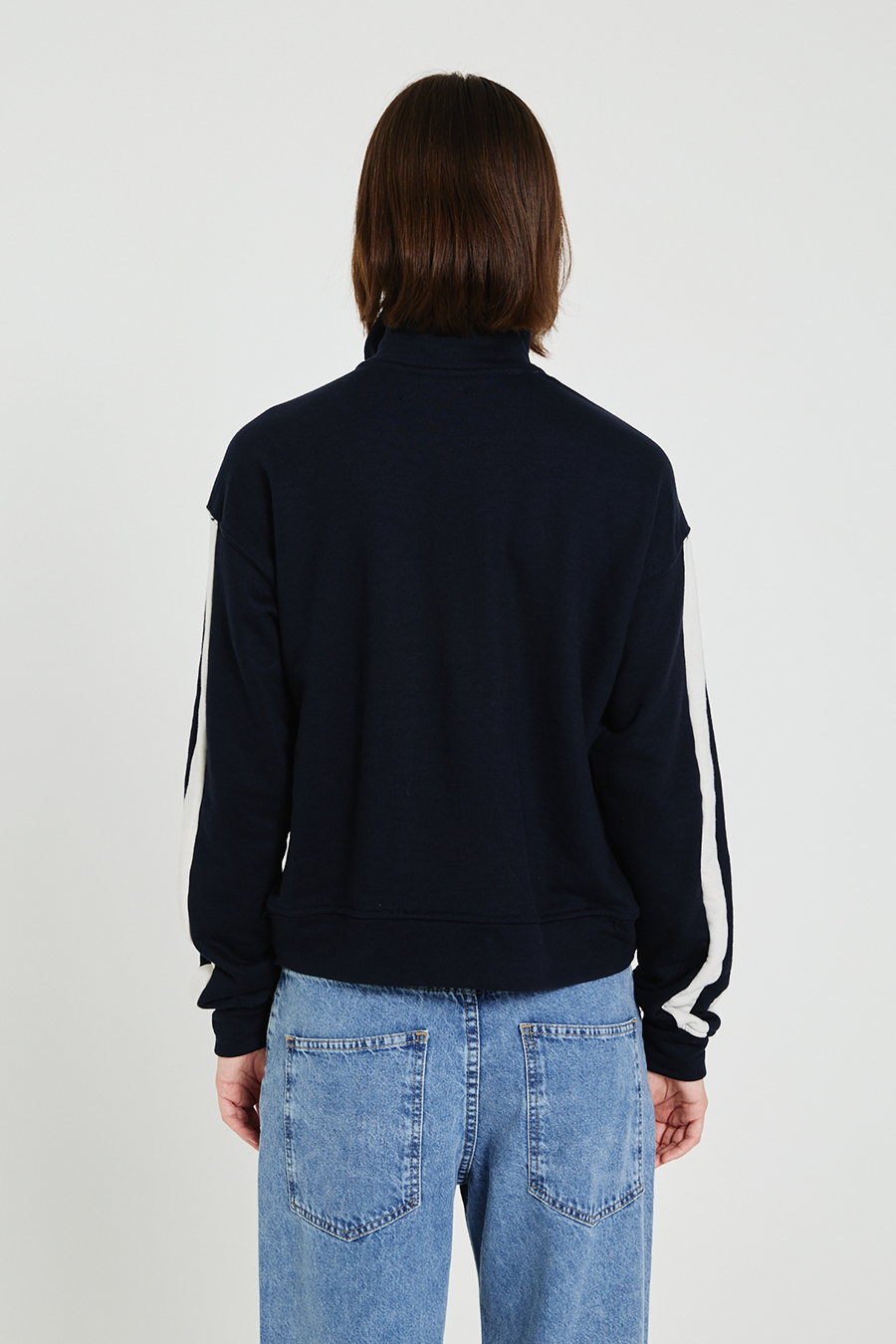 BUZO CONFECCIONADO EN RUSTICO CON CIERRE METALICO DE 20 CM, CONESTAMPA EN DELANTERO Y TIRAS EN CONTRATONO EN MANGAS