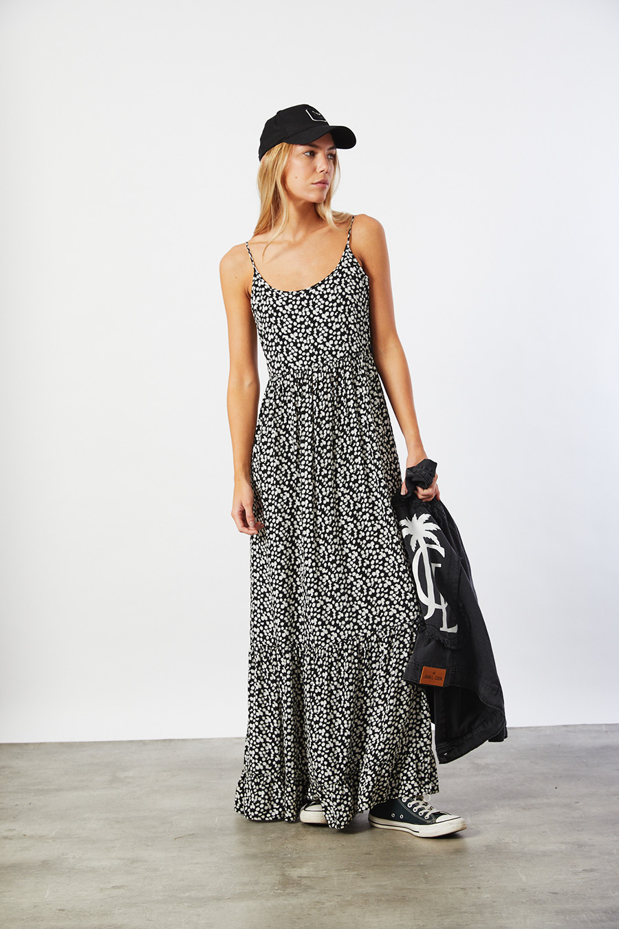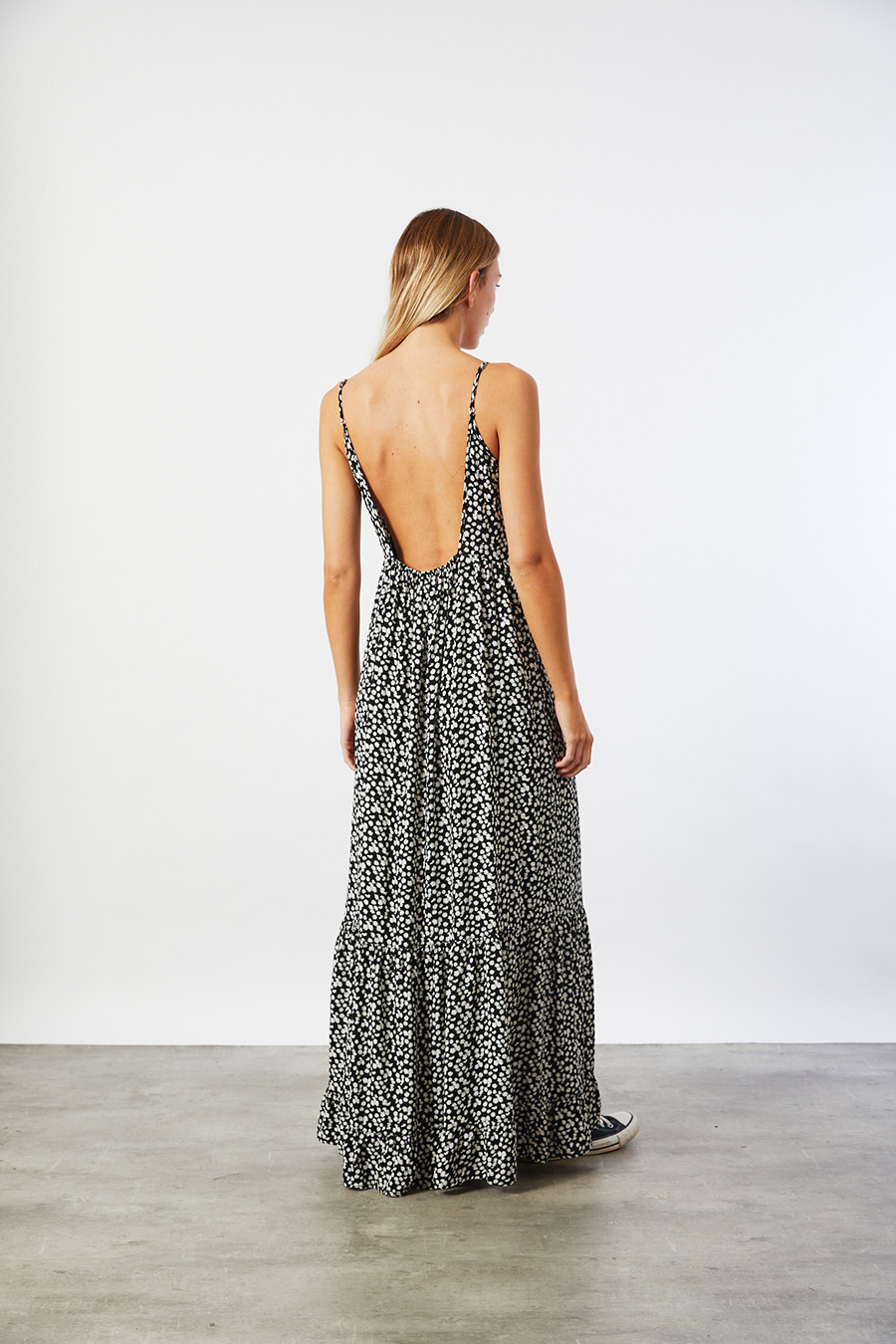 VESTIDO CONFECCIONADO EN RAYON ESTAMPADO CON BRETELES REGULABLES Y CINTURA DE ESPALDA CON ELÁSTICO.