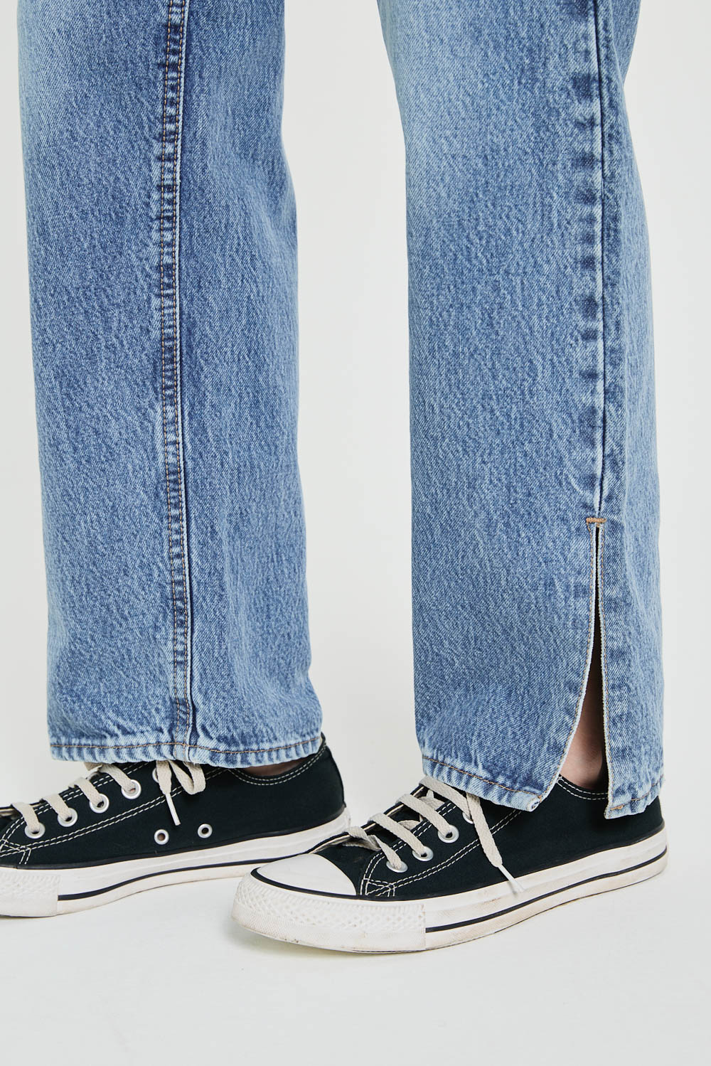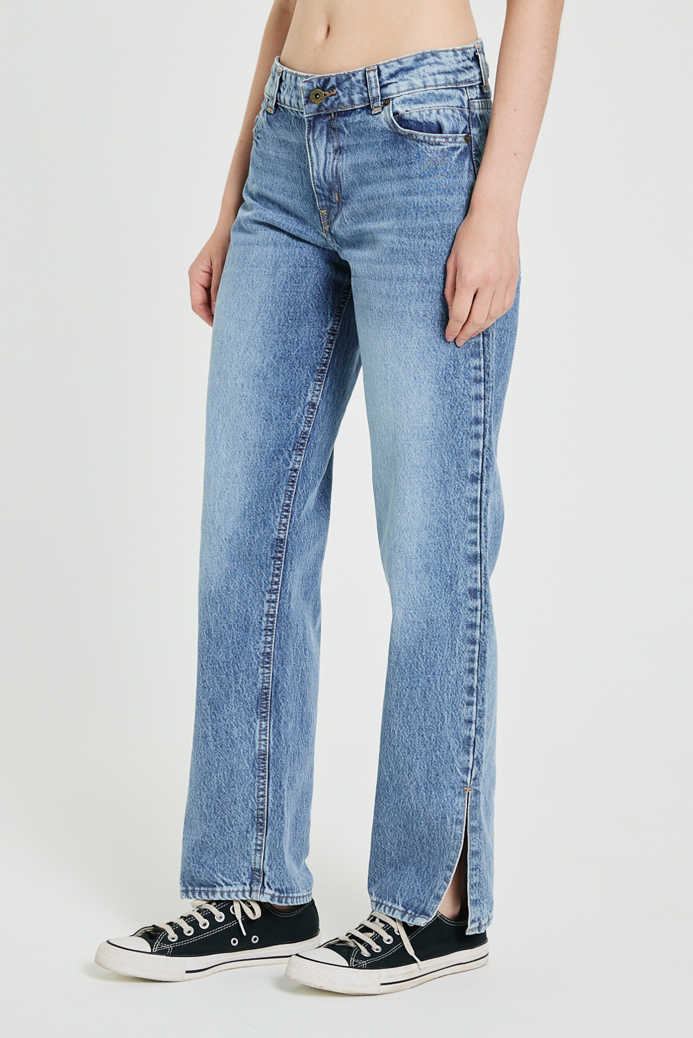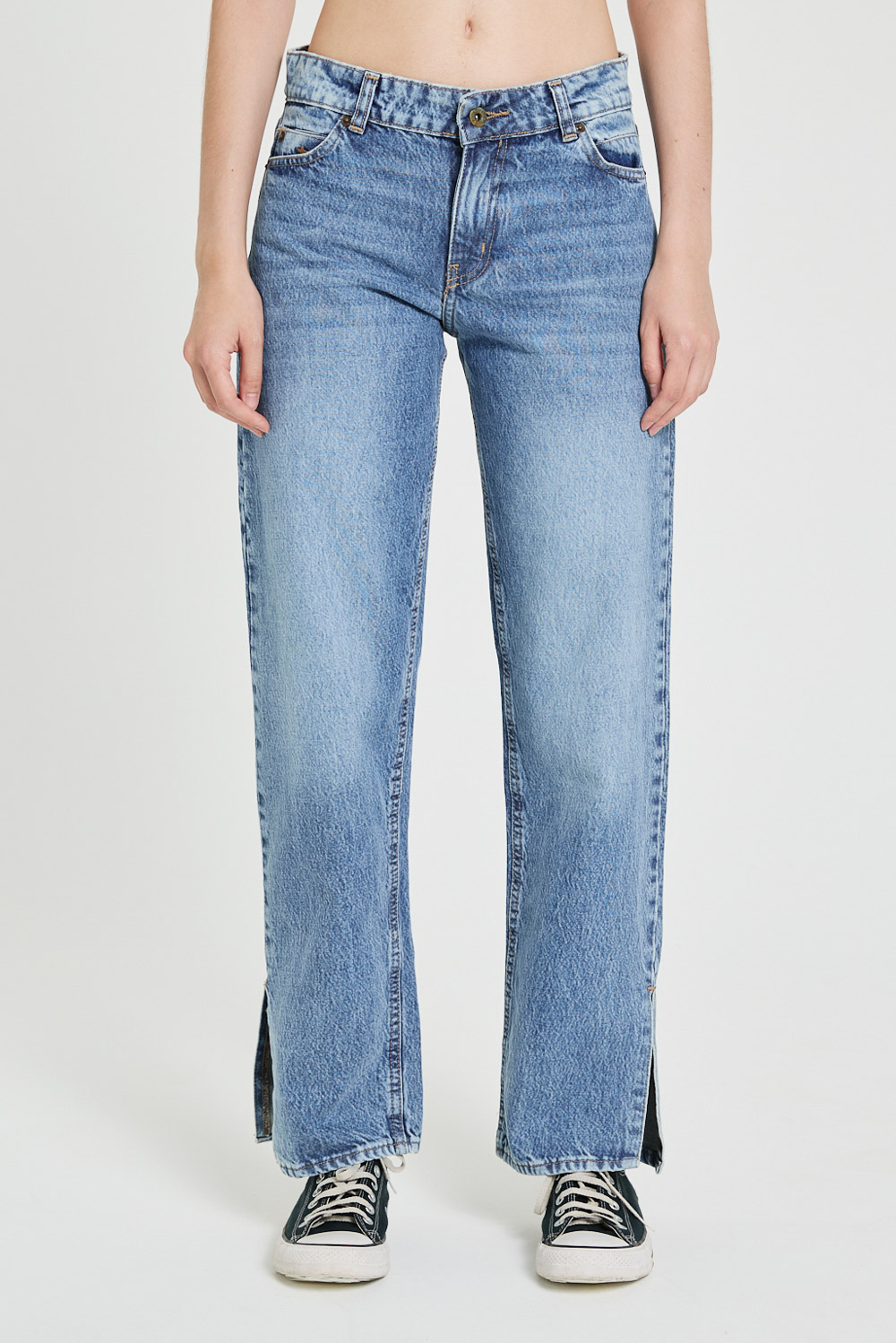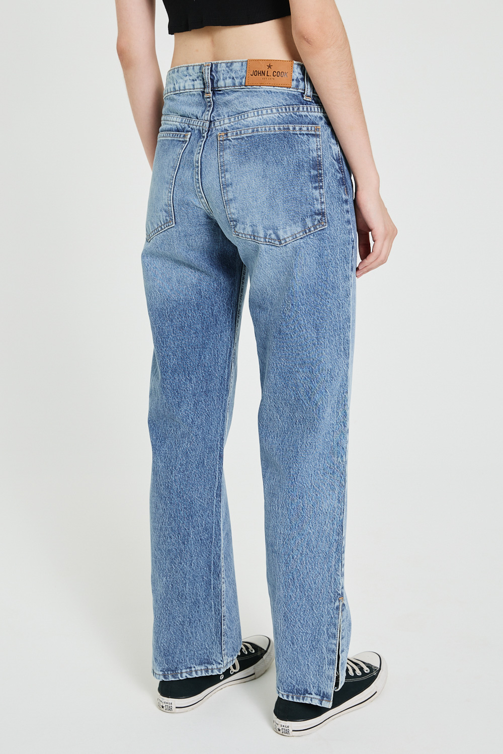 EL JEAN PARKER TIENE UN CALCE RECTO TIRO BAJO. TIENE UN LAVADO USED MID LIGHT BLUE, 5 BOLSILLOS Y UN TAJO EN EL LATERAL DE BOTAMANGA.