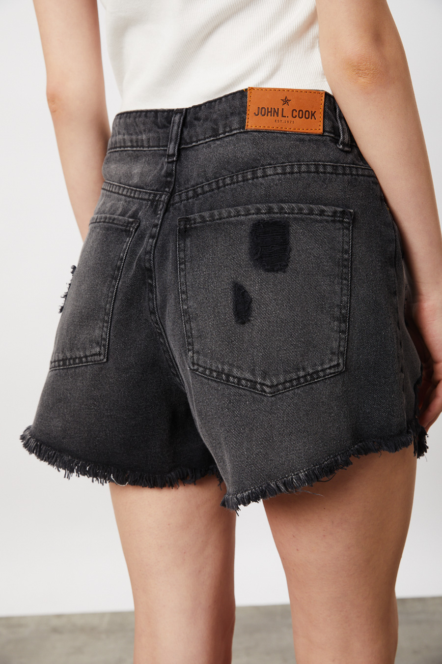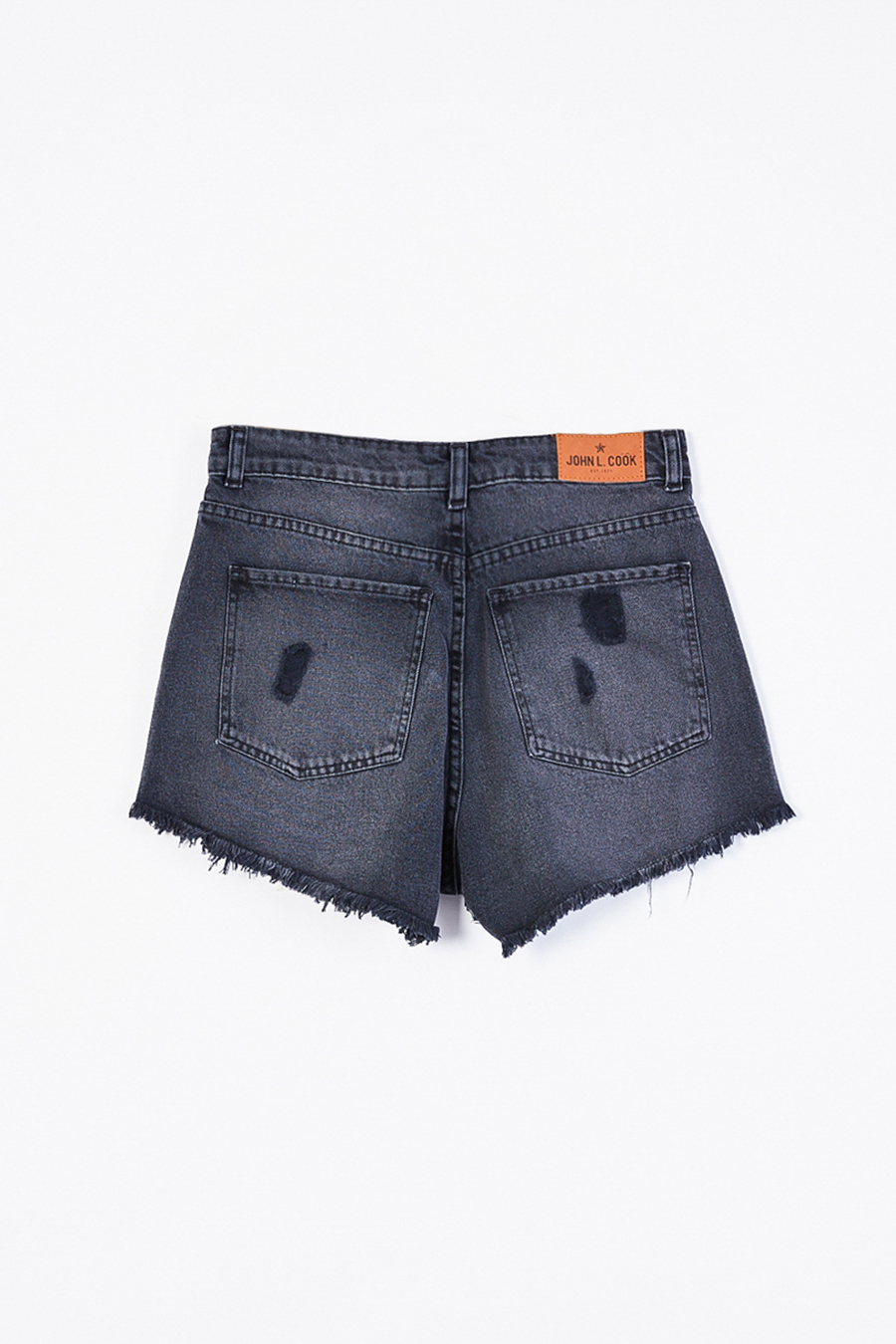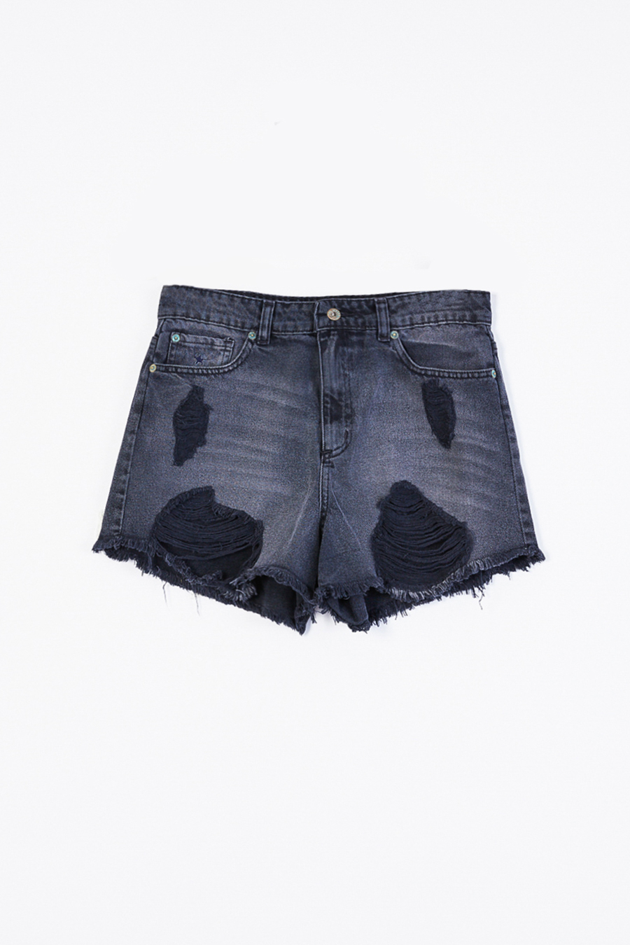 SHORT 5 BOLSILLOS CONFECCIONADO EN DENIM 100% ALGODÓN, CON LAVADO NEGRO GASTADO Y ROTURAS QUE DAN UN LOOK VINTAGE. RUEDO DESFLECADO.