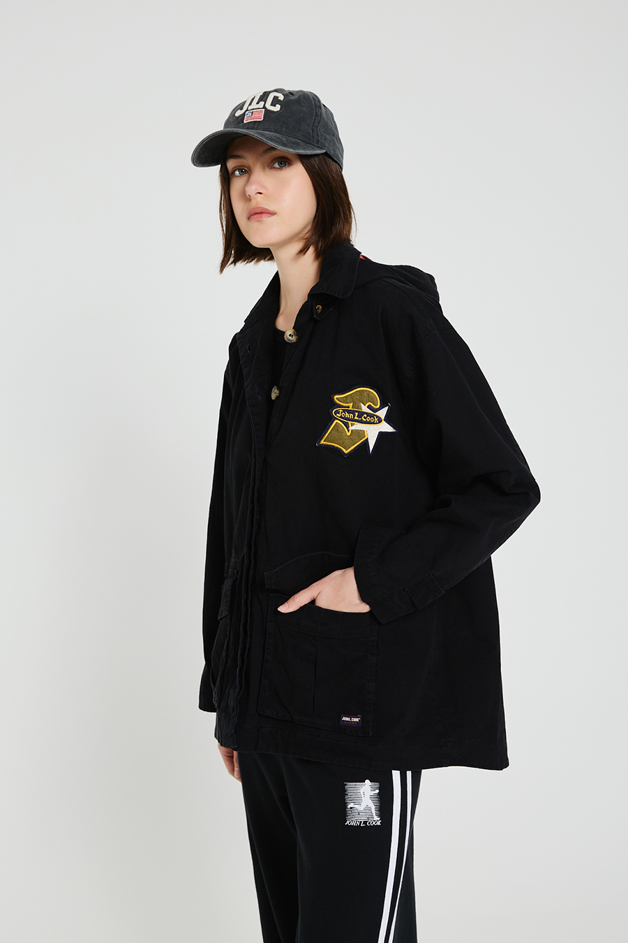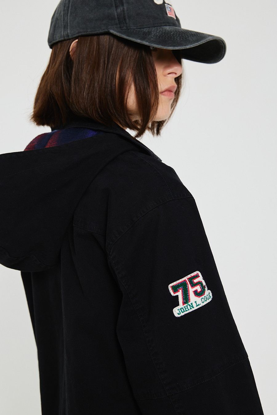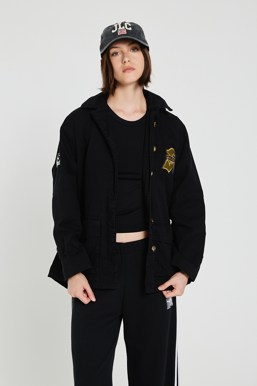 TIENE BOLSILLOS APLICADOS EN EL FRENTE, Y ESTA FORRADA CON PAÑO ESCOCES. ESTAMPADA CON SERIGRAFIA EN ESPALDA Y PARCHES APLICADOS EN MANGA Y F