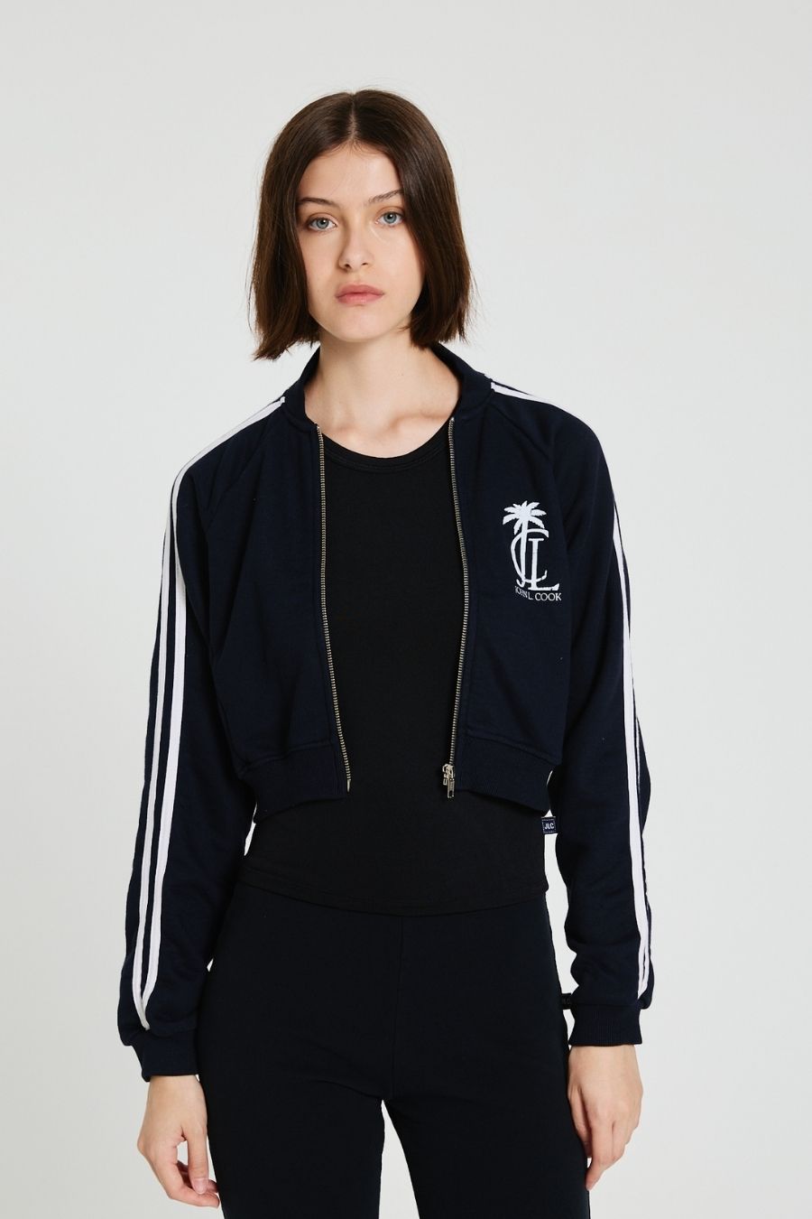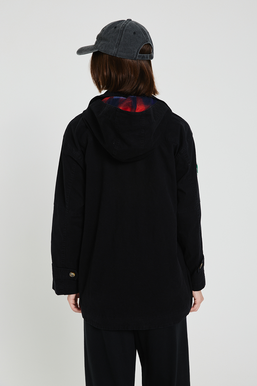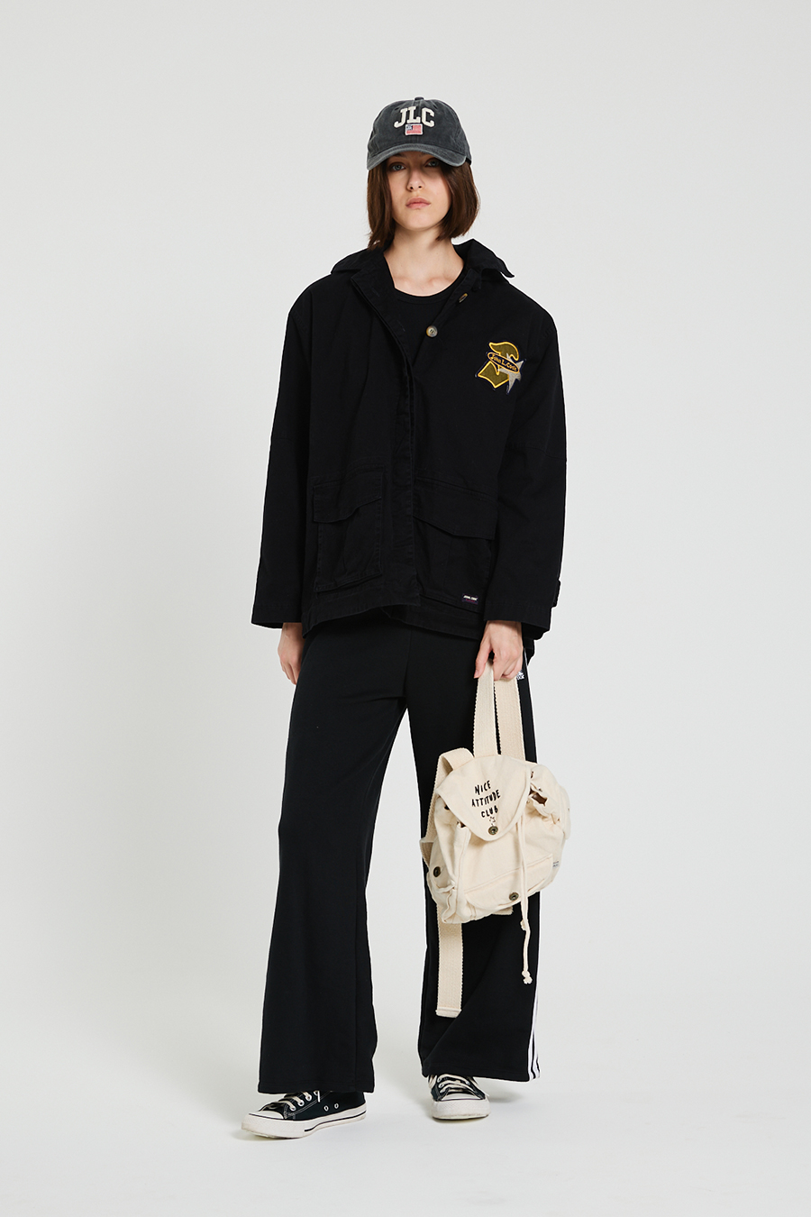 TIENE BOLSILLOS APLICADOS EN EL FRENTE, Y ESTA FORRADA CON PAÑO ESCOCES. ESTAMPADA CON SERIGRAFIA EN ESPALDA Y PARCHES APLICADOS EN MANGA Y F
