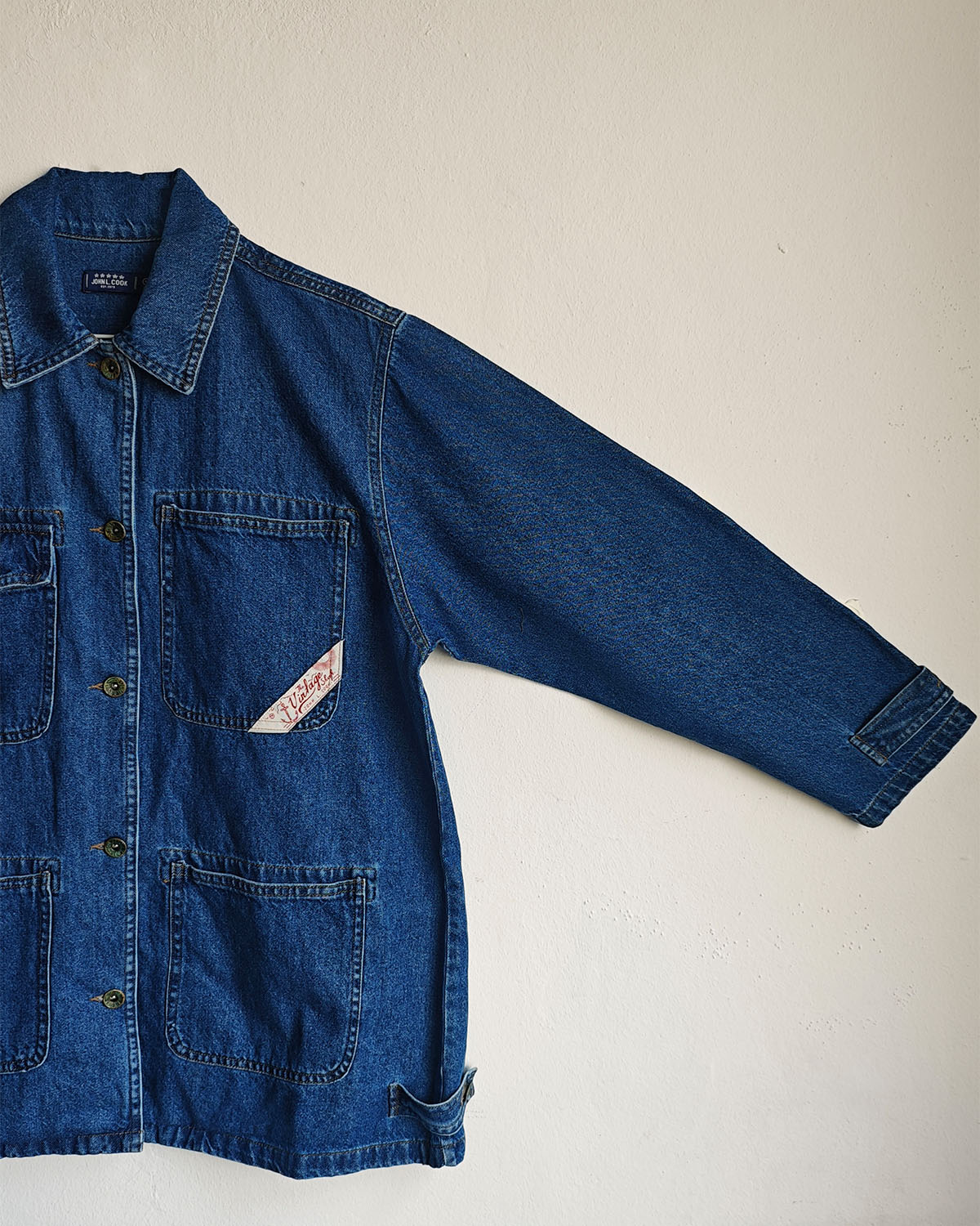 CAMPERA DE DENIM, CORTE BOXY, CON FORRERIA DE VIYELA. BOLSILLOS DELANTEROS PLAQUE Y BOTONES EN EL DELANTERO PARA ACCESO,CON ETIQUETA VINTAGE EN DETALLE DE BOLSILLO.