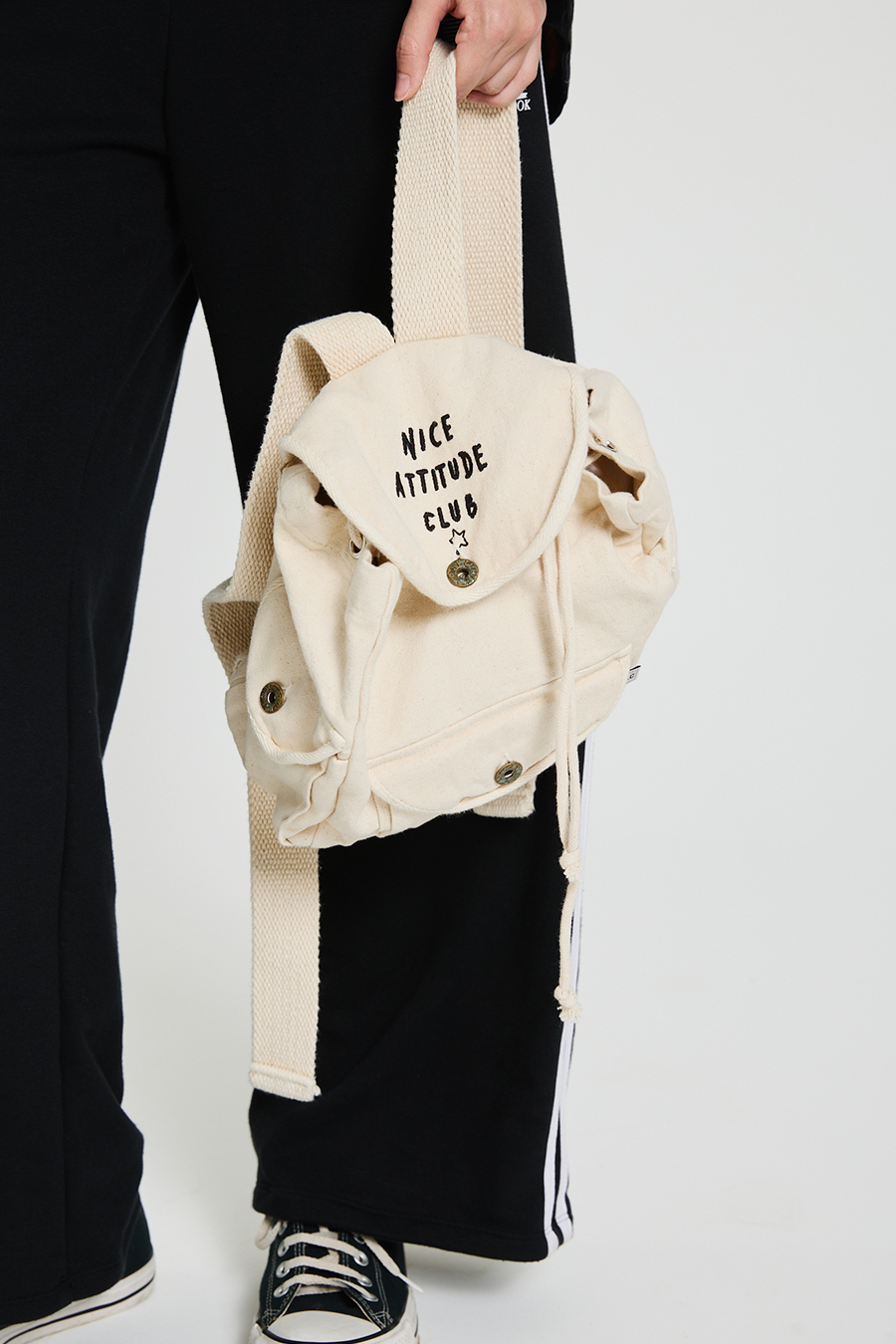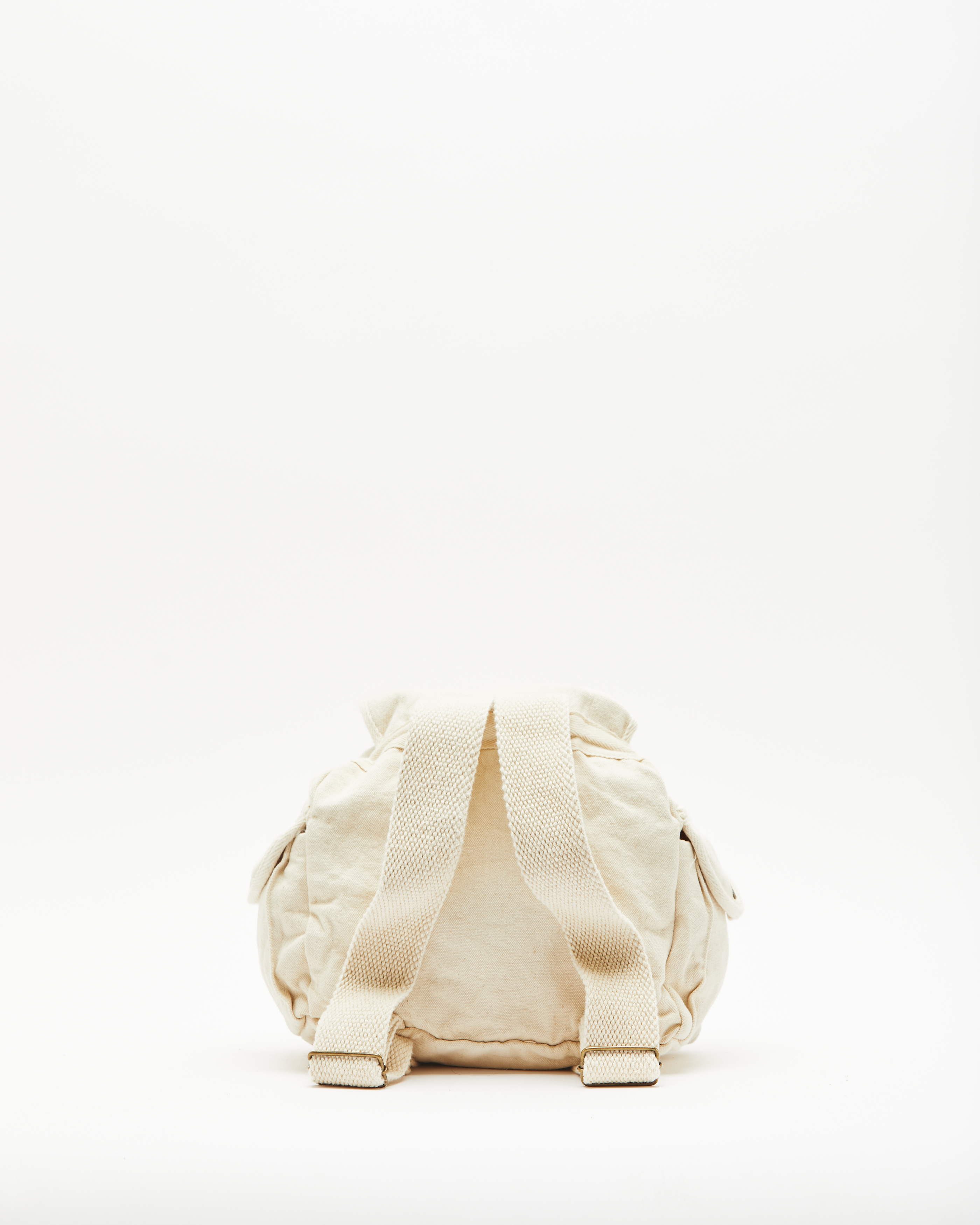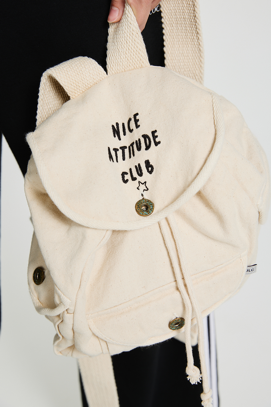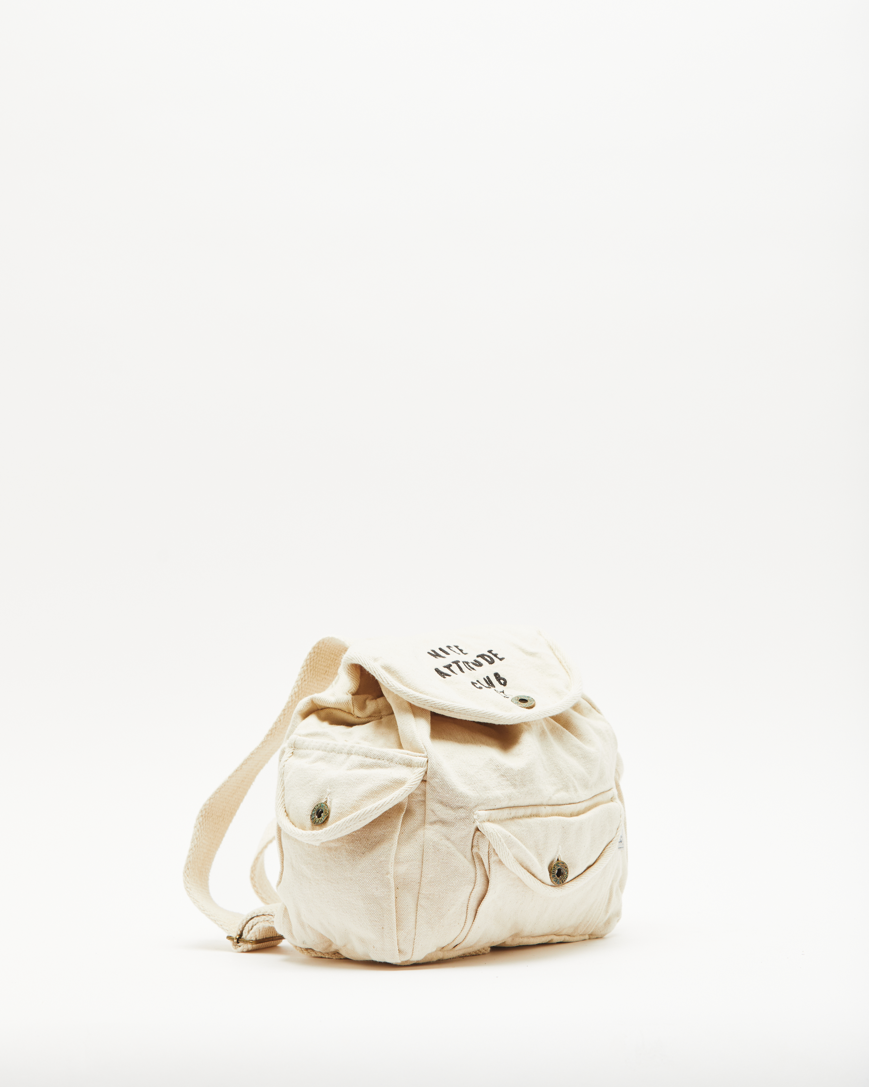 MINI MOCHILA DE LONA DE ALGODON, CON CORDON PARA AJUSTAR, Y CORREAS CON LARGO REGULABLE. INTERIOR ENVIVADO Y BORDADO EN EL FRENTE.